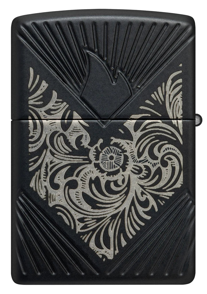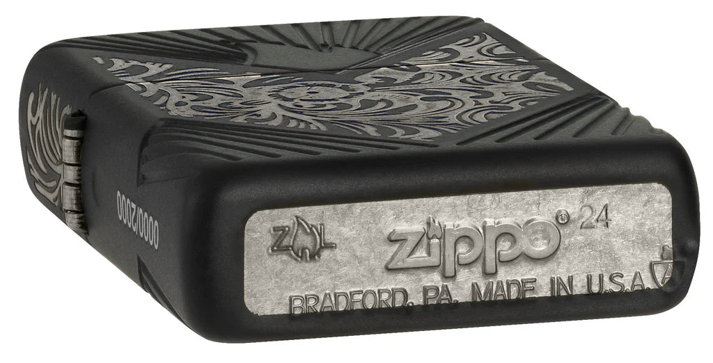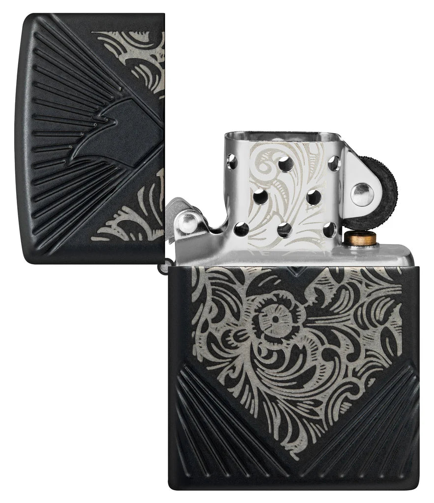 Το εμβληματικό μοτίβο Venetian® που παρουσιάστηκε ως Florentine το 1974, στροβιλίζεται σε όλες τις πλευρές της θήκης Armor® με τη διαδικασία Laser Engrave. Ο περίτεχνος σχεδιασμός έρχεται σε όμορφη αντίθεση με το Black Matte φινίρισμα, το οποίο έκανε το ντεμπούτο του το 1984, ενώ το εικονίδιο Zippo βρίσκεται ανάμεσα σε διαγώνιες ρίγες MultiCut σε μια ωδή στο πρώτο σχέδιο Deep Carve που αποκαλύφθηκε το 2004. Τέλος, το βενετσιάνικο μοτίβο αντιγράφεται με λεπτή χάραξη με λέιζερ στο ένθετο χρωμίου, το οποίο επιλέχθηκε ειδικά για την Ευρώπη, τη Μέση Ανατολή και την Αφρική.