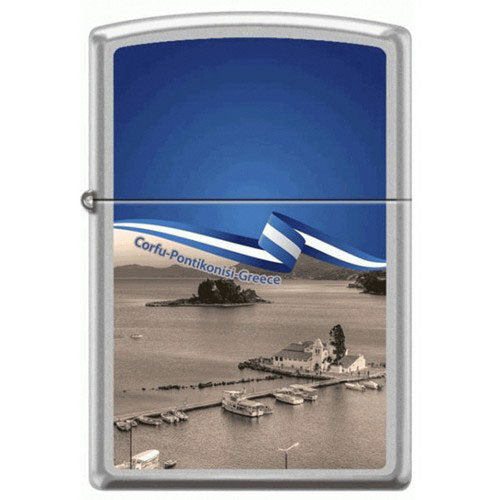 Κλασικός αντιανεμικός αναπτήρας Zippo με φινίρισμα Satin Chrome, με απεικόνιση το Ποντικονήσι της Κέρκυρας και την ελληνική σημαία.
