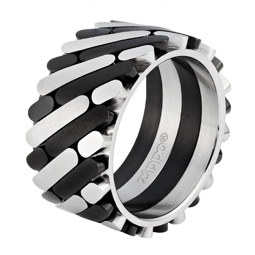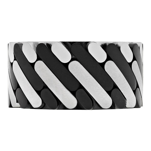 Ένα εκφραστικό αξεσουάρ! Το μοτίβο σε μαύρο και ασήμι συνθέτουν το σχέδιο αυτού του δακτυλιδιού, που αποτελείται από βουρτσισμένο και γυαλισμένο ανοξείδωτο ατσάλι. Ένα εξαιρετικό σχέδιο από αυτό το άφθαρτο υλικό. Έρχεται συσκευασμένο σε ένα κουτί δώρου.