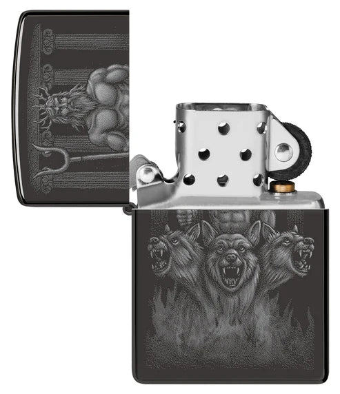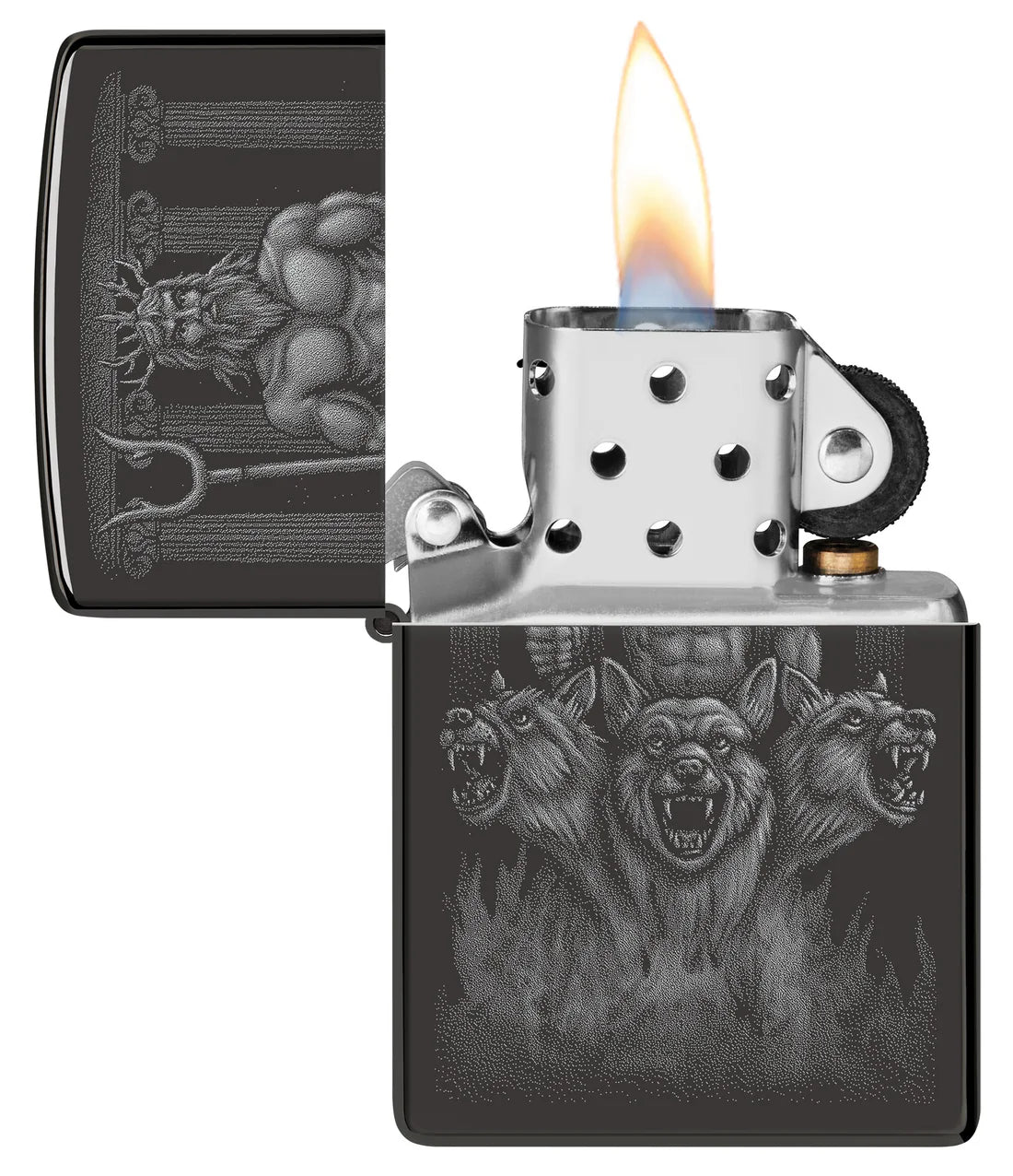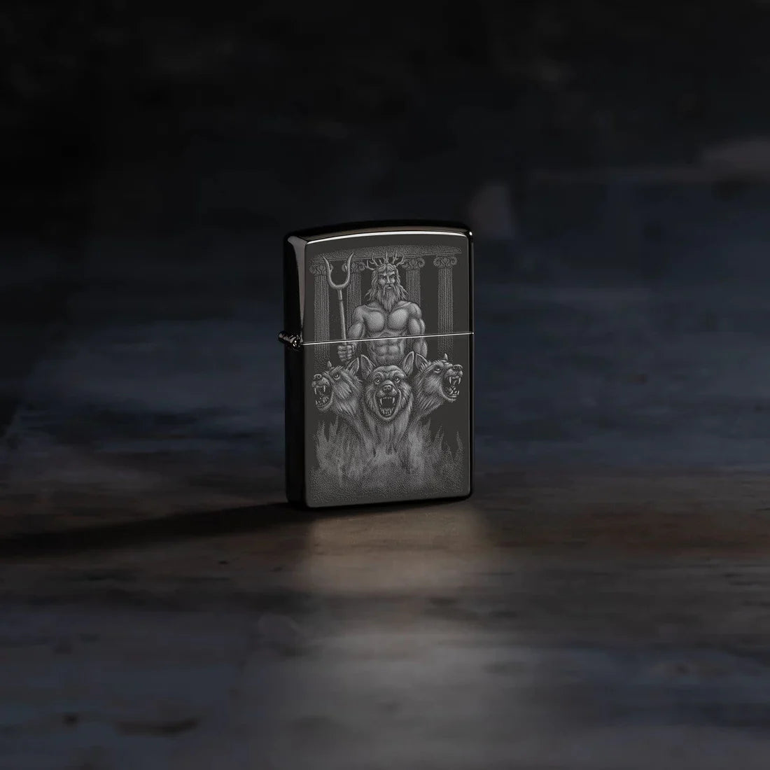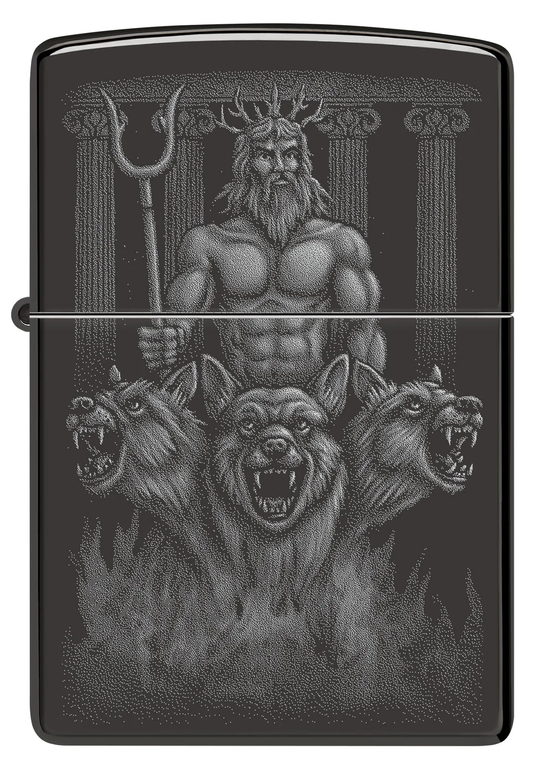 Πλαισιωμένος από μοχθηρούς σκύλους-φύλακες, ένας βασιλικός θεός στέκεται στωικά σε αυτόν τον κλασικό αναπτήρα High Polish Black σε ένα εντυπωσιακό σχέδιο με απεικόνιση Photo Image. Διατίθεται συσκευασμένο σε συσκευασία δώρου. Για βέλτιστη απόδοση γεμίστε με καύσιμο αναπτήρα Zippo.
