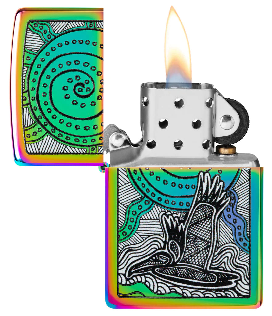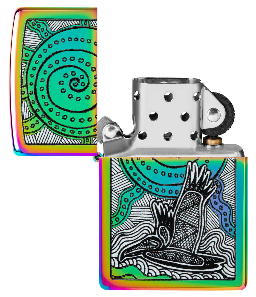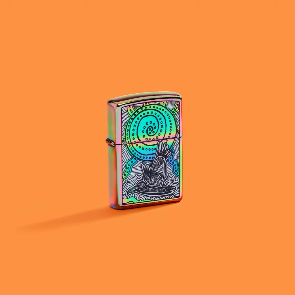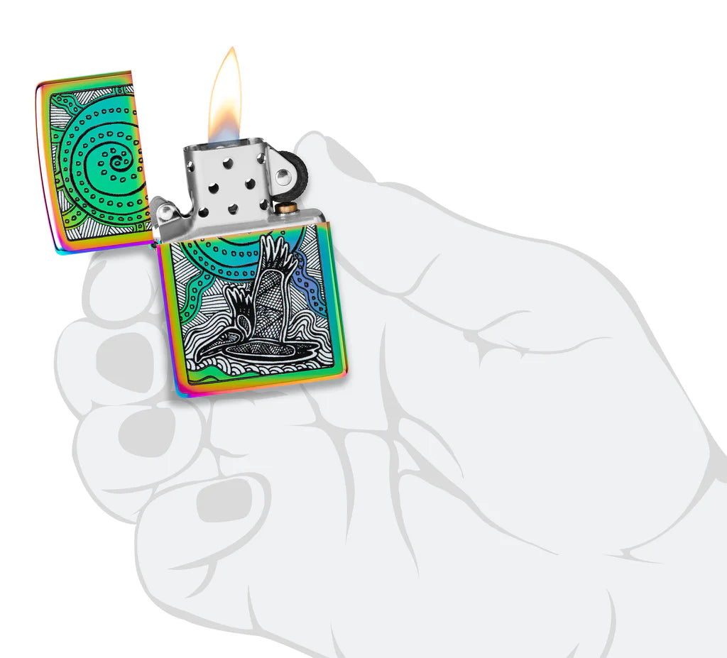 Εμπνευσμένος από τους πλούσιους τόνους και τα ζωηρά χρώματα της κουλτούρας και της χώρας του, ο Αυστραλός Αβορίγινος καλλιτέχνης και πρεσβευτής John Smith Gumbula είναι παθιασμένος με τις τέχνες, τις πολιτιστικές υποθέσεις και την καινοτομία για περισσότερα από 30 χρόνια. Αυτός ο εκθαμβωτικός αναπτήρας Multi Color επιδεικνύει το εμβληματικό του στυλ σε ένα μαγευτικό σχέδιο Color Image που εμφανίζει ένα τροπικό πουλί και μια θαλάσσια χελώνα στο στυλ της ιθαγενούς τέχνης. Διατίθεται συσκευασμένο σε συσκευασία δώρου. Για βέλτιστη απόδοση γεμίστε με καύσιμο αναπτήρα Zippo.
