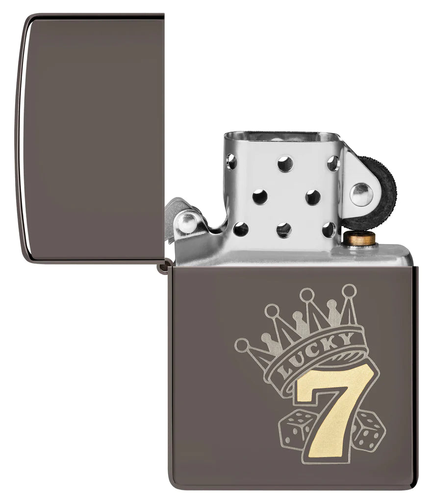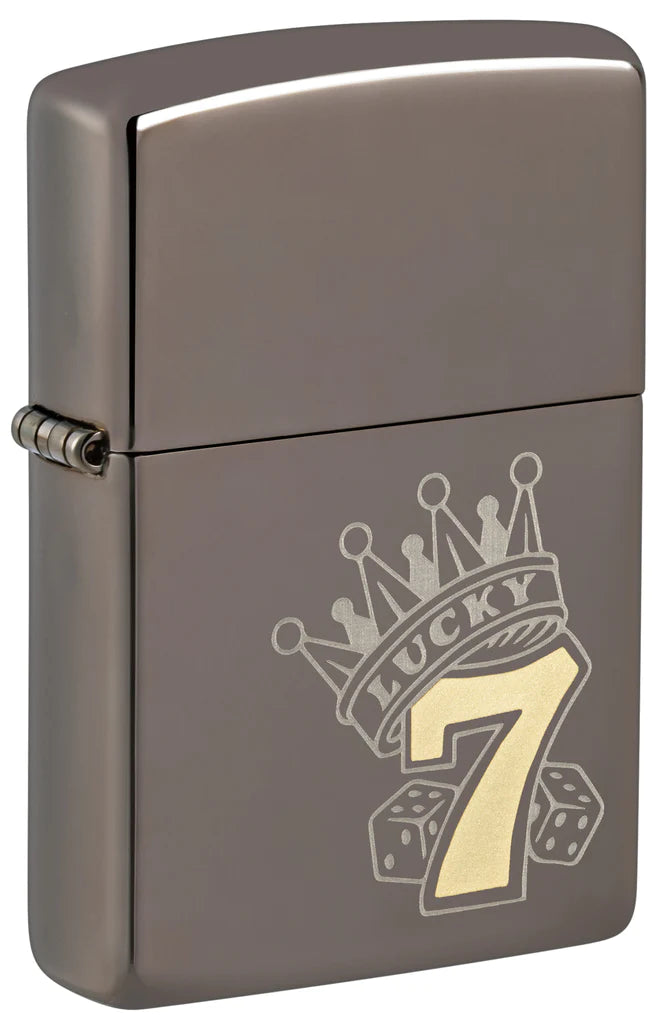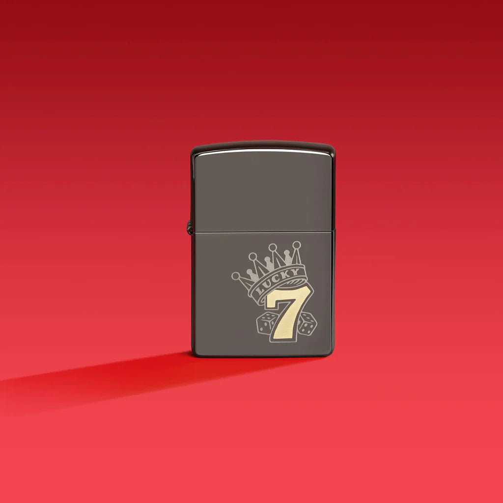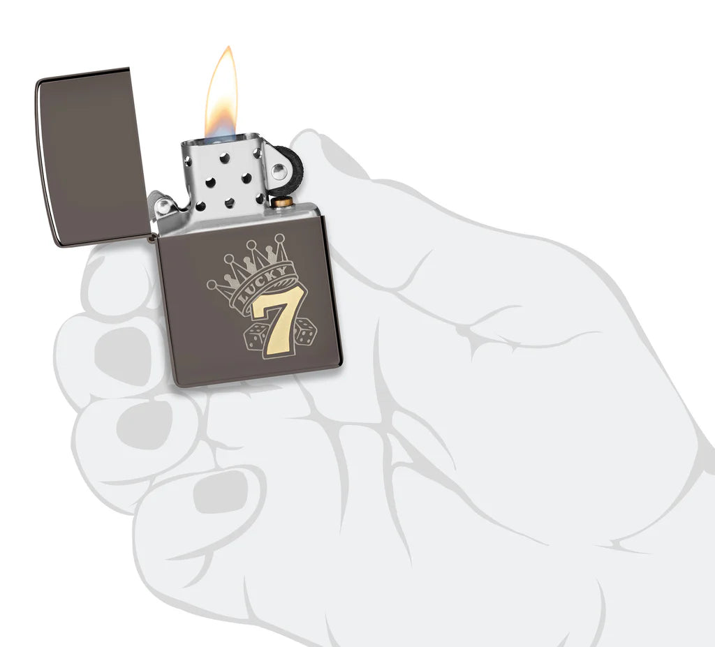 Χρησιμοποιήστε αυτόν τον κομψό αναπτήρα Black Ice® για να ενισχύσετε την τύχη σας όπου κι αν πάτε. Χρησιμοποιήσαμε τη διαδικασία Laser Two-Tone για να απεικονίσουμε ένα Lucky 7, με ένα τυχερό στέμμα και ένα ζευγάρι ζάρια, σε πολυτελείς ορείχαλκους τόνους. Διατίθεται συσκευασμένο σε συσκευασία δώρου. Για βέλτιστη απόδοση γεμίστε με καύσιμο αναπτήρα Zippo.