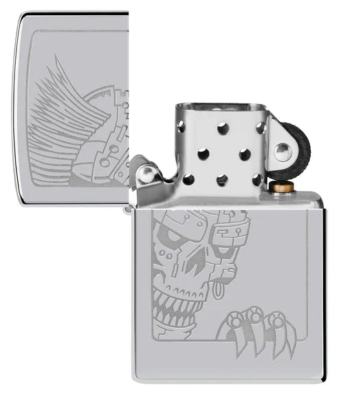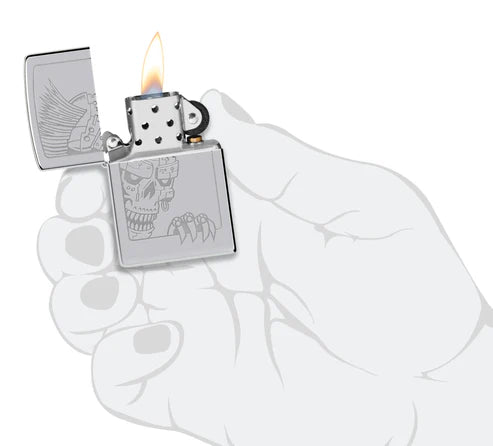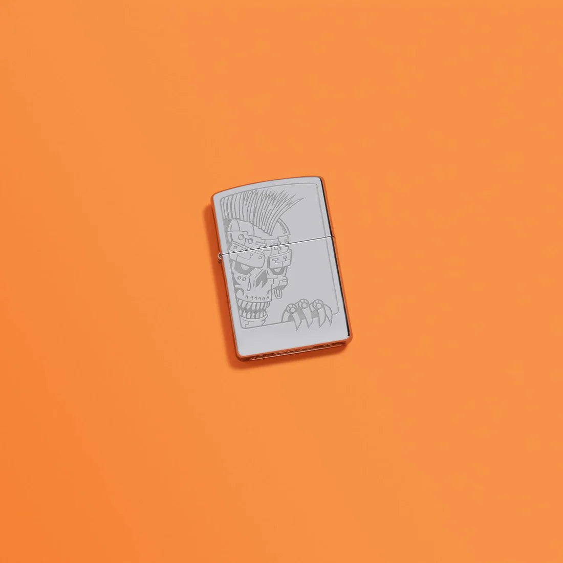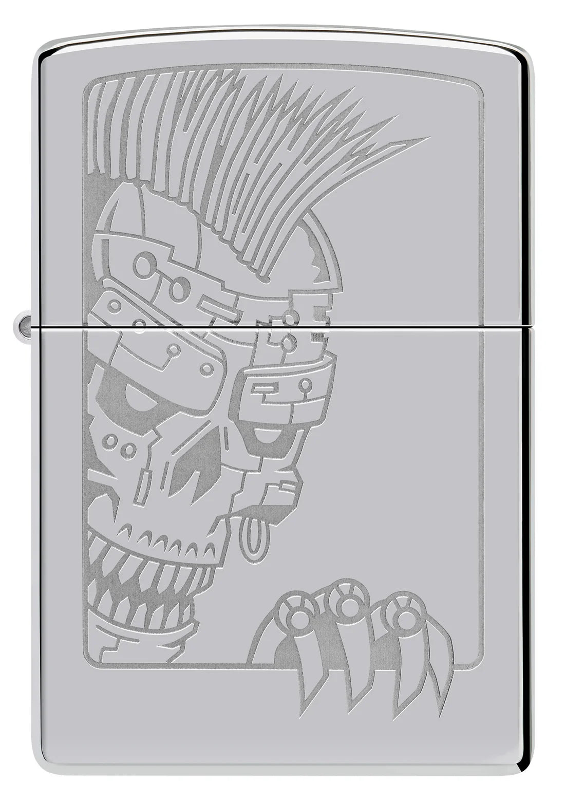 Έχοντας ένα έντονο χτένισμα μοχόκ, ένας σκελετός που χαμογελά έρχεται στο επίκεντρο αυτού του κλασικού αναπτήρα χρωμίου High Polish σε περίπλοκο σχέδιο Luster.