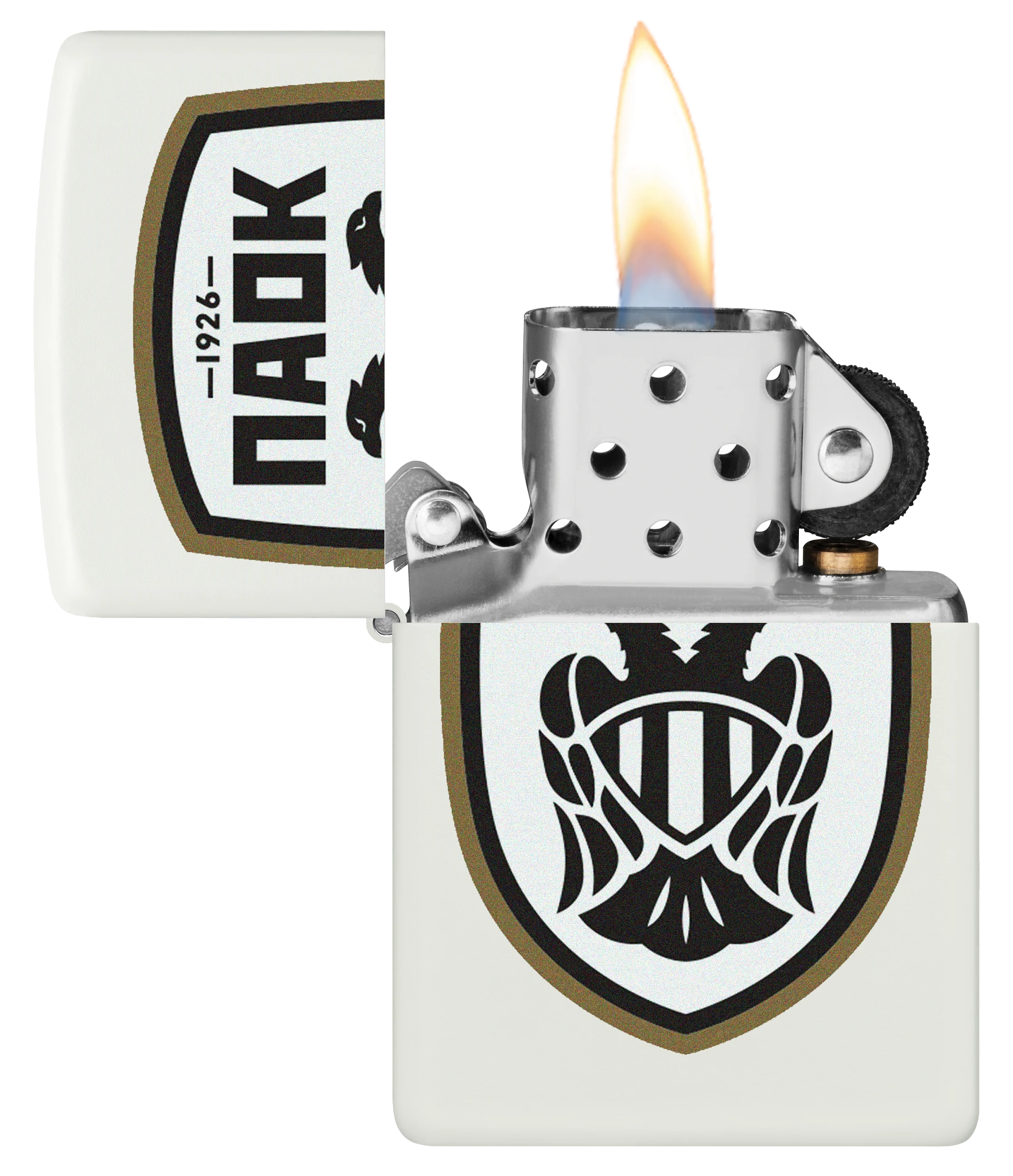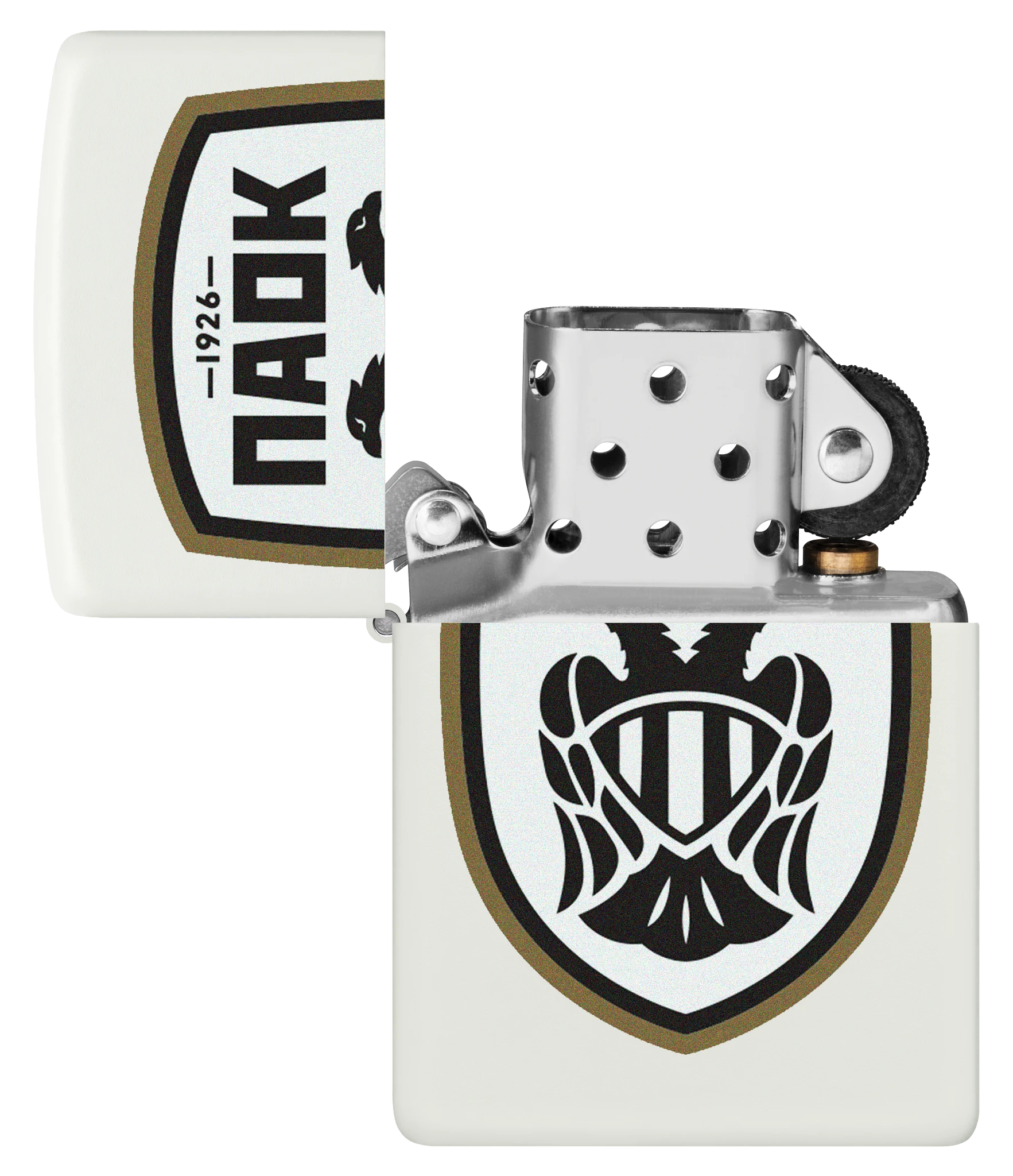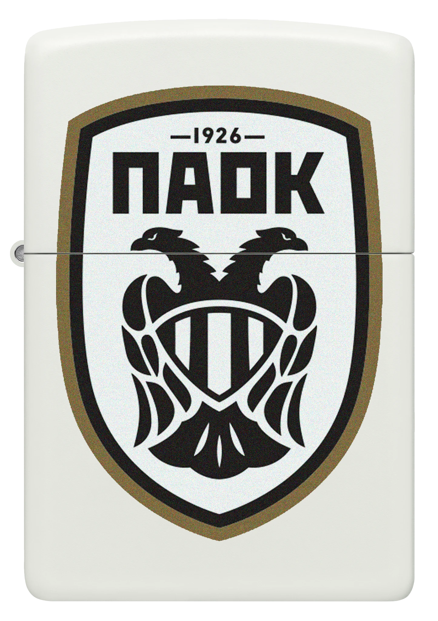 Ένας αναπτήρας σε ένα απαλό φινίρισμα White Matte, με την ασπίδα που περιέχει τον Δικέφαλο Αετό, τη λέξη "ΠΑΟΚ" και την ημερομηνία ίδρυσης της ομάδας