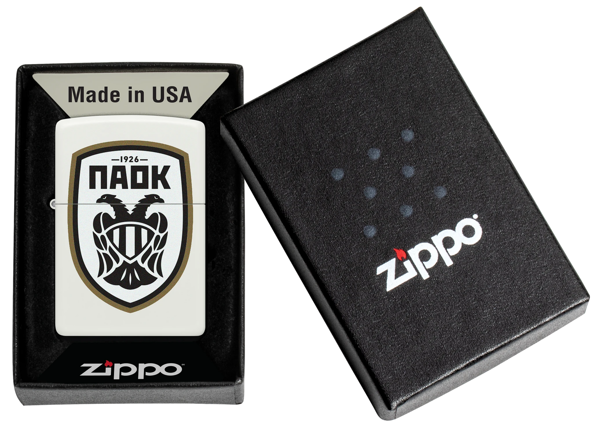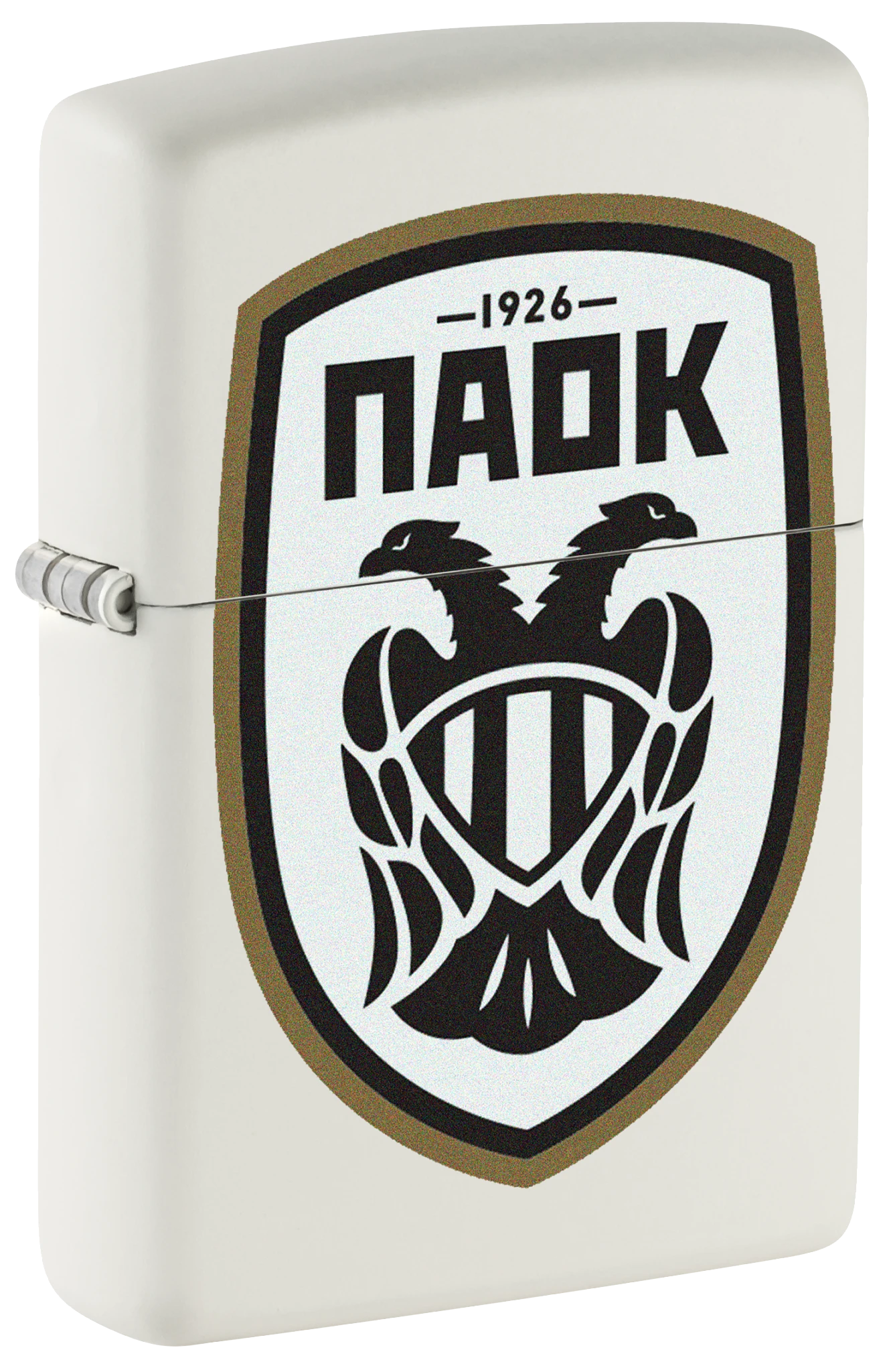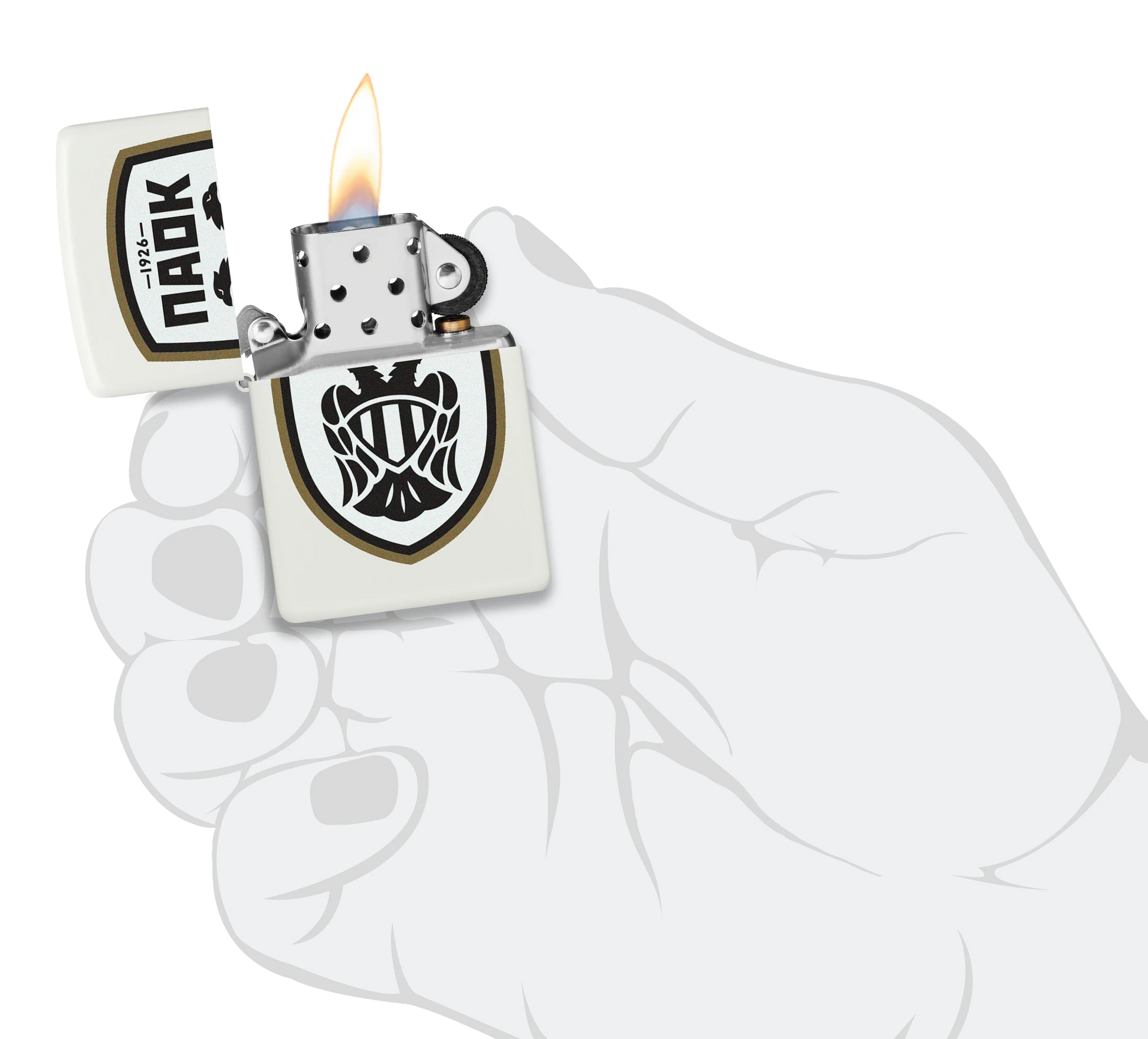 Ένας αναπτήρας σε ένα απαλό φινίρισμα White Matte, με την ασπίδα που περιέχει τον Δικέφαλο Αετό, τη λέξη "ΠΑΟΚ" και την ημερομηνία ίδρυσης της ομάδας