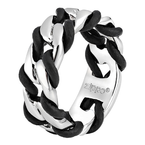Ένα υπέροχο ζεύγος. Η λεπτή δερμάτινη λωρίδα συνδέεται με συνδέσμους από ανοξείδωτο ατσάλι δημιουργώντας αυτό το εκπληκτικό σχέδιο σε αυτό το δαχτυλίδι. Με ανάγλυφο το λογότυπο Zippo στο εσωτερικό του, έρχεται συσκευασμένο σε ένα κουτί δώρου.