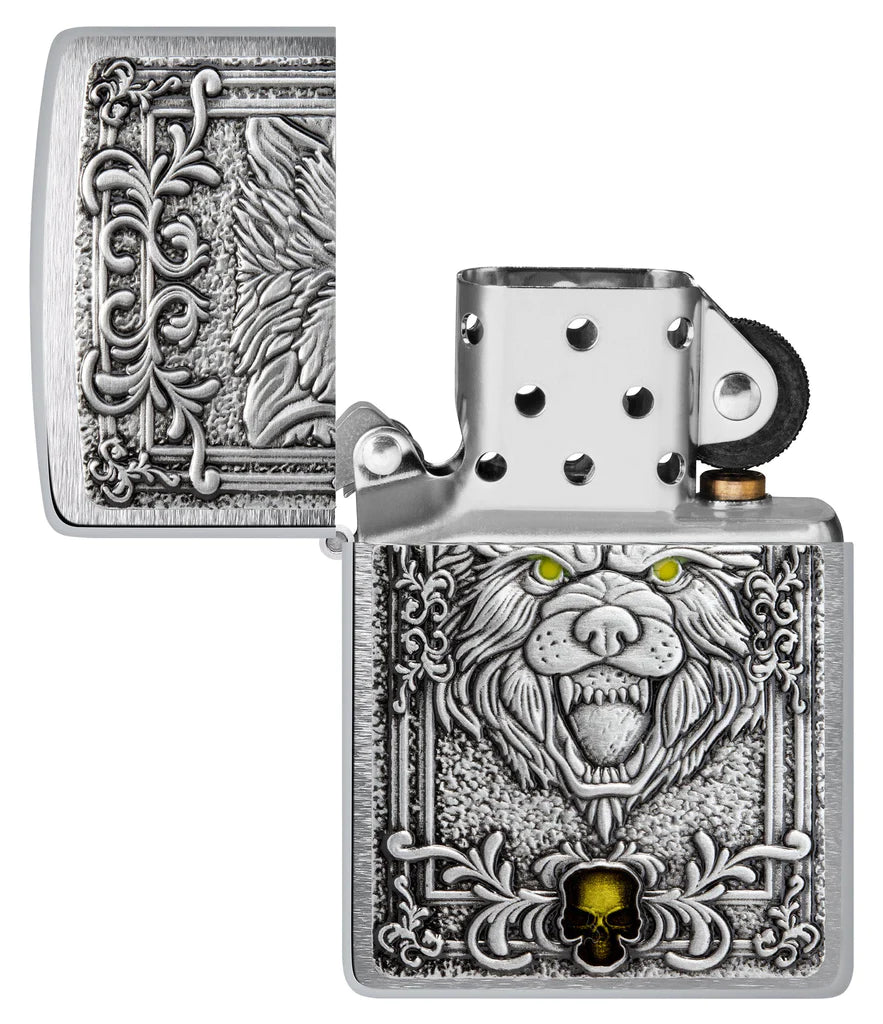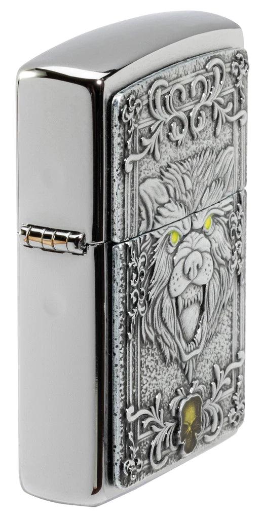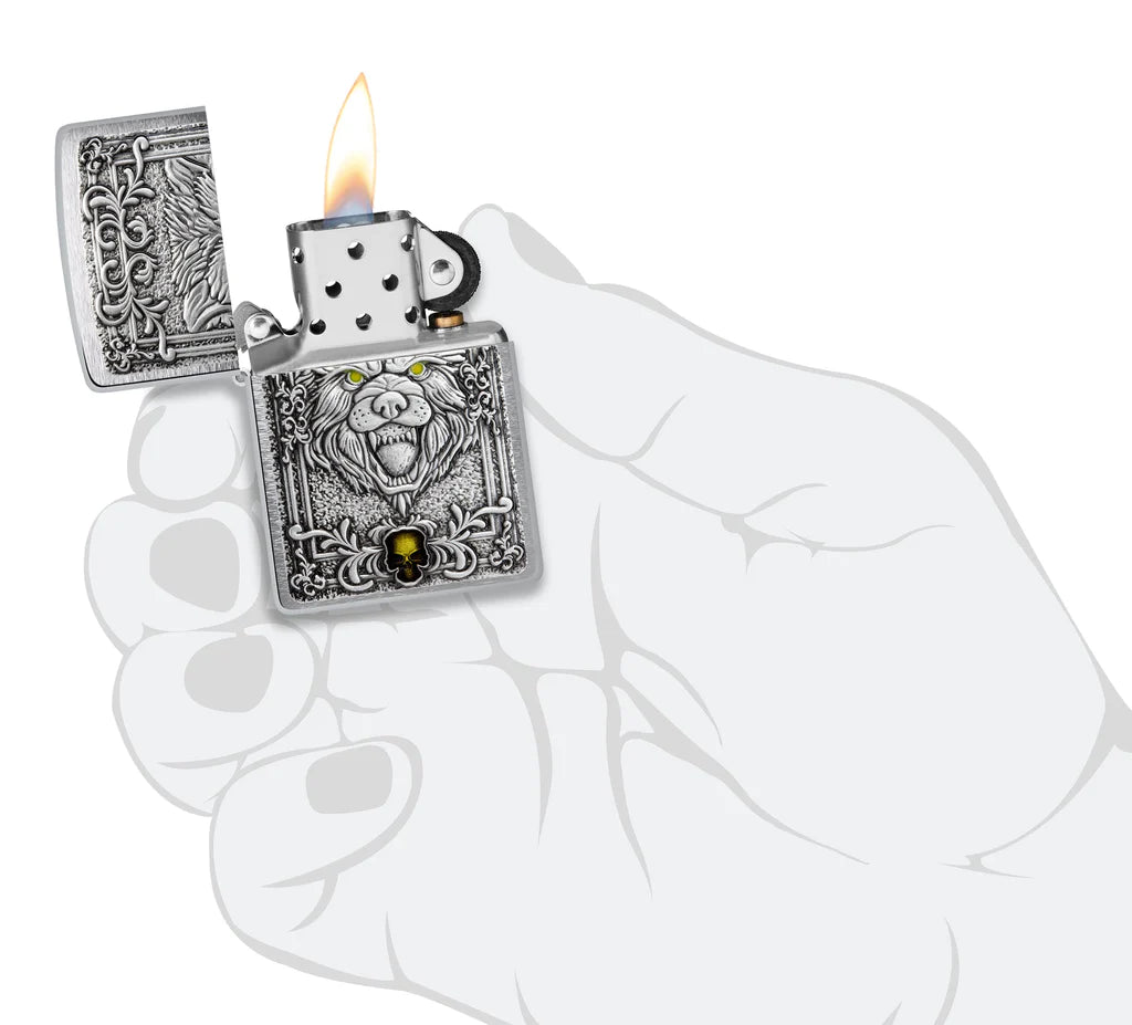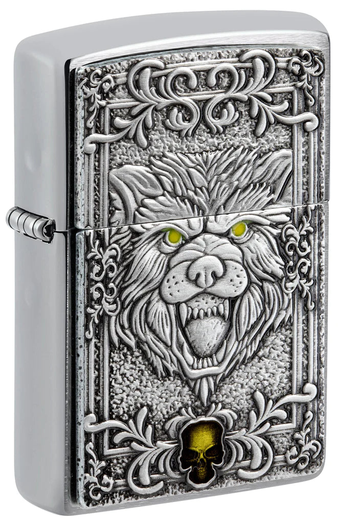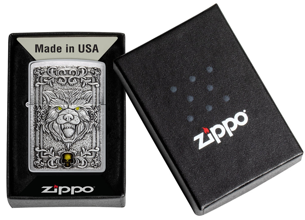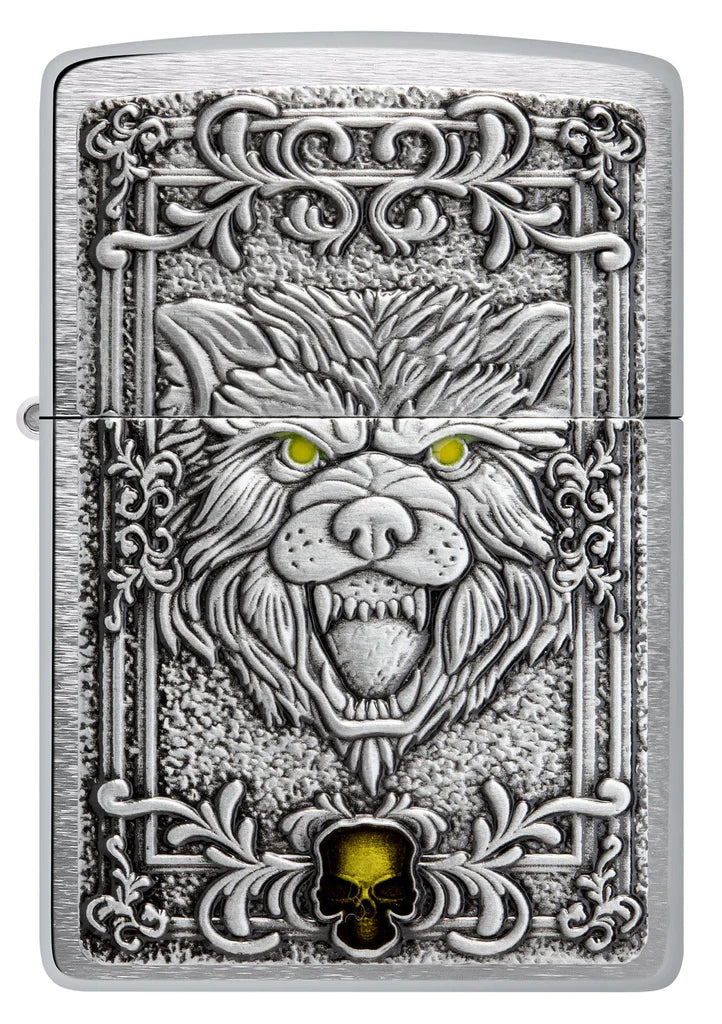 Ένας άγριος λύκος βγαίνει από την επιφάνεια αυτού του κλασικού αναπτήρα Brushed Chrome. Το τρομακτικό έμβλημα διαθέτει στροβιλιζόμενα φιλιγκράν και λαμπερούς ορειχάλκινους τόνους για πρόσθετη πολυτέλεια. Διατίθεται συσκευασμένο σε συσκευασία δώρου. Για βέλτιστη απόδοση, γεμίστε με καύσιμο αναπτήρα Zippo.